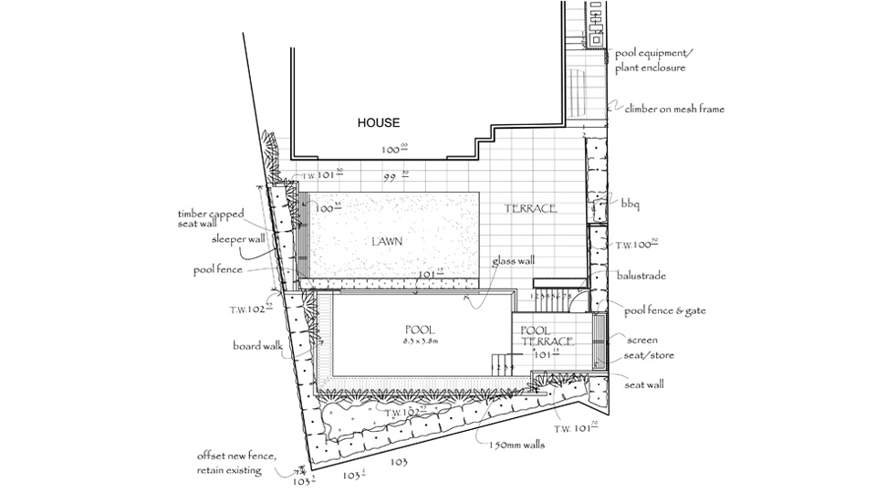 We formed three terraces into the existing slope. The main terrace consisted of a paved and grassed area directly accessible from the newly extended living area. A pool concourse area, accessible via masonry steps, provided a designated paved and seating area for poolside activities. The upper terrace, with a sprayed concrete retaining wall, held large sloped garden beds. The project also involved the repositioning of pool equipment, demolition of an existing pool and the construction of a new pool. Works included recycled timber benches, a pool ‘boardwalk’, custom built storage benches, feature timber screens, and custom designed galvanised steel pool fencing. We also provided a 12,000 litre water storage tank under the grass terrace.